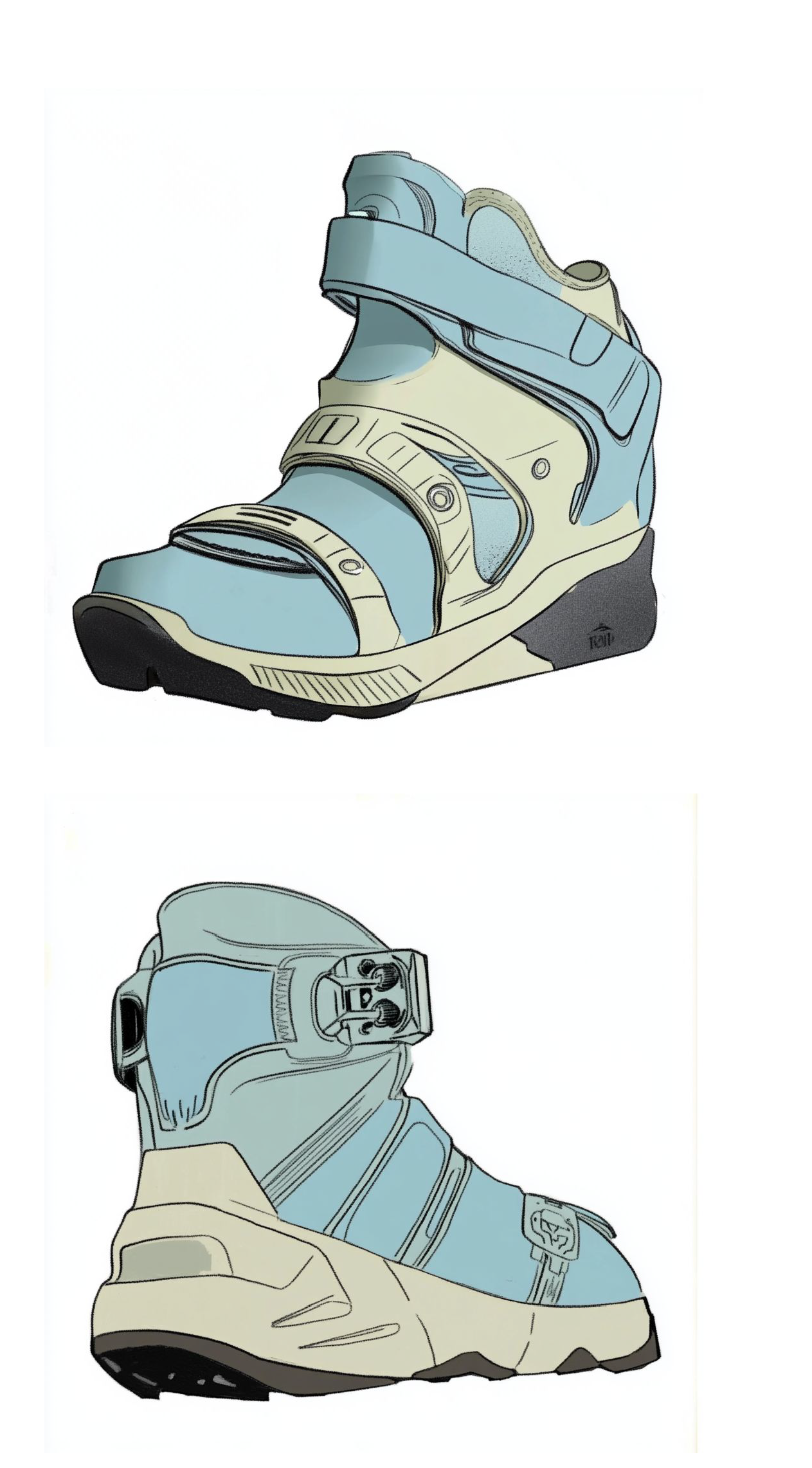 I like the futuristic exoskeleton look of modern snowboard bindings, and wanted to design a fashionable sneaker taking visual and functional inspiration from the bindings. The large straps serve as an alternative to velcro or shoelaces, with adjustable tightness. The shape of the blue piece connected to the straps is very similar to the bindings and provides ankle support.